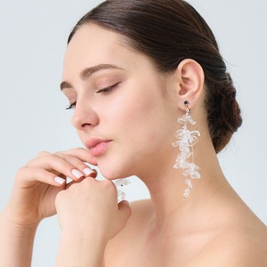 透明なフラワーが瑞々しい輝きを放つデザインのイヤリング。 ボリュームのあるシルエットと優しい光の反射がお顔を明るく輝かせます。 素材:金具部分・真鍮にロジウムカラープレート、アクリル、クリスタルカットビーズ