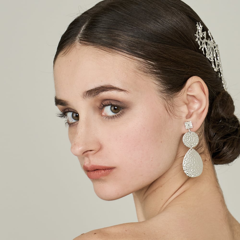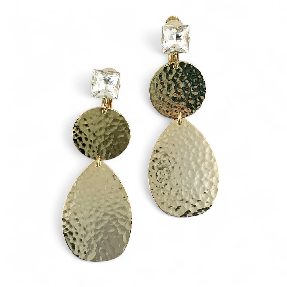 クラフト的な温かみのある槌目のあるプレートで構成した幾何学的なデザインのイヤリング。 モダンな印象のデザインです。スタイルに洗練さをプラスし、日常使いから特別な日まで幅広く活躍します。 素材:GOは真鍮にゴールドカラープレート、SIはロジウムカラープレート、ラインストーンクリスタル
