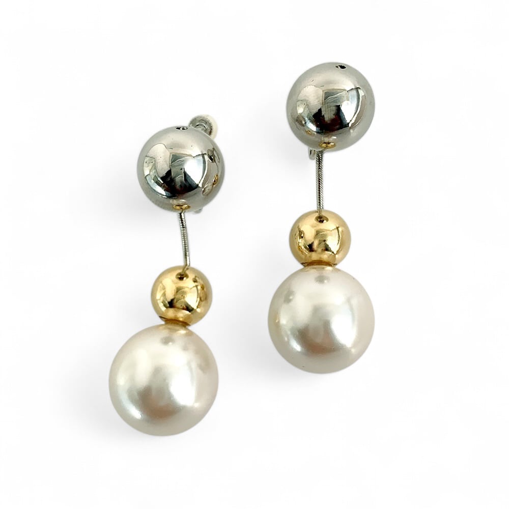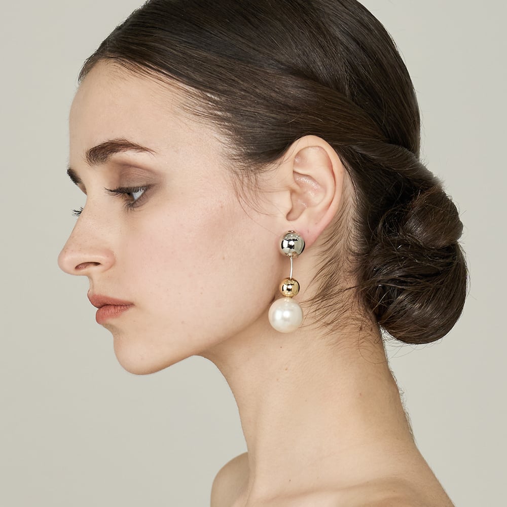メタリックボールの質感が際立つモダンなデザインのGeometricイヤリング&ピアス。大粒パールとのコンビネーションが、シンプルでありながら洗練された印象を与えます。日常使いはもちろん、少し華やかなシーンでもお洒落に演出できるアイテムです。 素材:GOは真鍮にゴールドカラープレート、SIはロジウムカラープレート、プラスチックパール