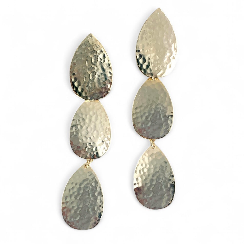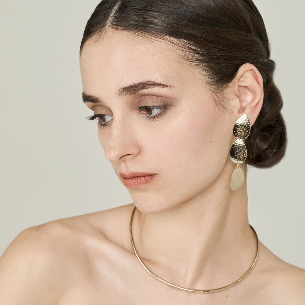 クラフト的な温かみのある槌目のあるプレートで構成した幾何学的なデザインのイヤリング。 モダンな印象のデザインです。スタイルに洗練さをプラスし、日常使いから特別な日まで幅広く活躍します。 素材:GOは真鍮にゴールドカラープレート、SIはロジウムカラープレート、