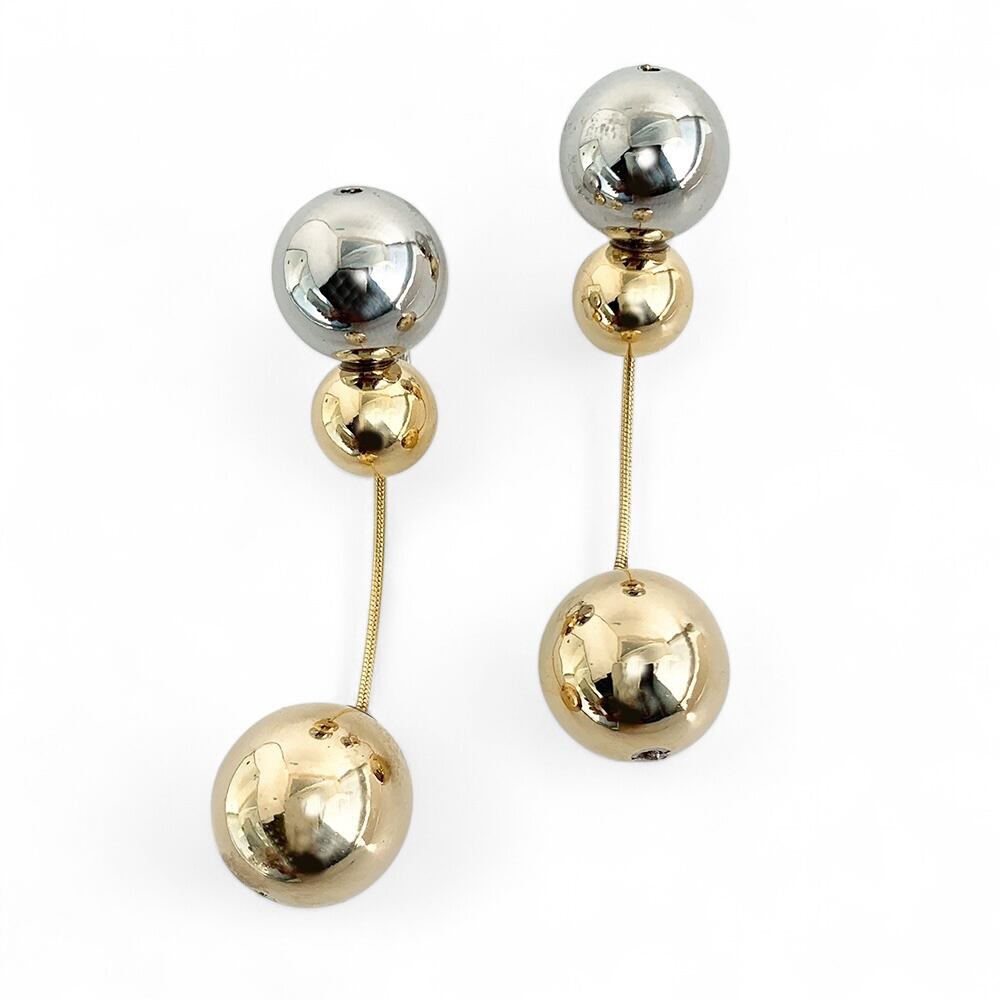 メタリックボールの質感が際立つモダンなデザインのGeometricイヤリング&ピアス。シルバーとゴールドのコンビネーションが、シンプルでありながら個性的な印象を与えます。日常使いはもちろん、少し華やかなシーンでもお洒落に演出できるアイテムです。 素材:真鍮にゴールドカラープレート、ロジウムカラープレート