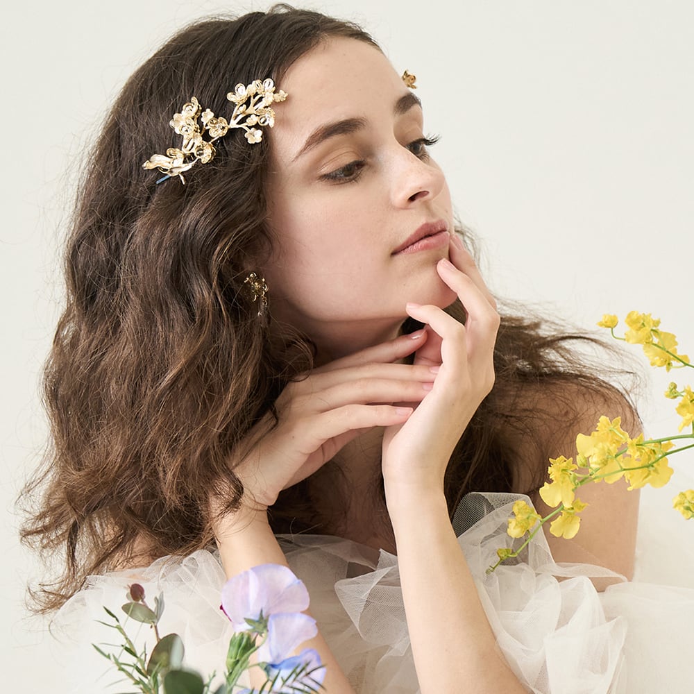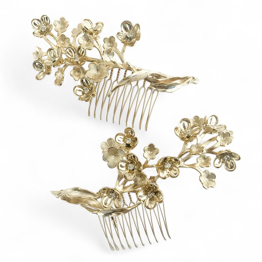 型押しの真鍮フラワーパーツでライラックのような華やかなヘッドピース2個セット 素材:真鍮にゴールドプレート