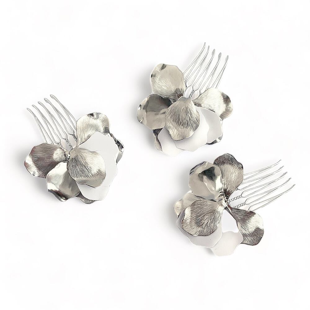 型押し真鍮のペタルとホワイトシークイン(スパンコール)のコンビネーションで ひなげしのようなシルエットのコーム3個セットです。 素材:GOは真鍮にゴールドカラープレート、SIはロジウムカラープレート、シークイン